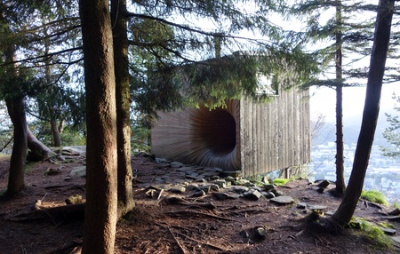 There is a small wooden cabin perched on the edge of the forest on Mount Fløyen, above the rooftops of …