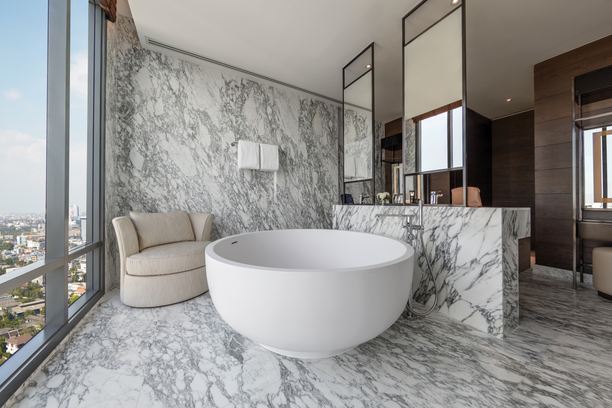 The four different suites are named after significant royal periods of Thai history. The Sukhothai Kingdom was the first Thai kingdom, and then the Ayutthaya Kingdom took over under the name of Siam (present-day Thailand). The Thonburi Kingdom was short-lived and preceded the Rattanakosin Kingdom, the last royal period of Siam and the name for the most luxurious suite in the hotel. Whichever you'll book, they are all exceptionally spacious. The smallest suite Sukhothai is 70 sqm (753 sqft), and it comes with a marble bathroom with the hotel's signature circular bathtub overlooking Bangkok's rooftops. The bed's 400-thread-count Egyptian bed linen is a guarantee for a good night's sleep, and the balcony with a daybed and a rocking chair is the best spot to read your favorite book.