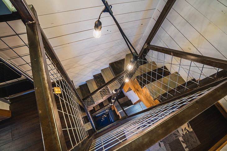 Luckily, not all attention went into the exterior design. As a result, the interior is similarly impressive. The industrial design exterior is contrasted by a farmhouse-style interior that uses repurposed materials. Some of the decorative wood is over 300 years old.