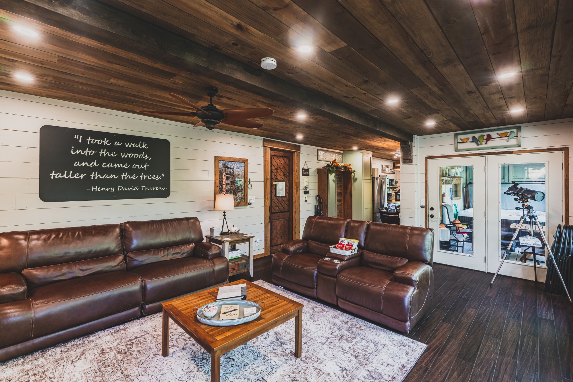 The living room opens to an outdoor porch with a hot tub overlooking the beautiful nature of Ladonia from the canopy level. The bird and squirrel feed brings the animals closer.