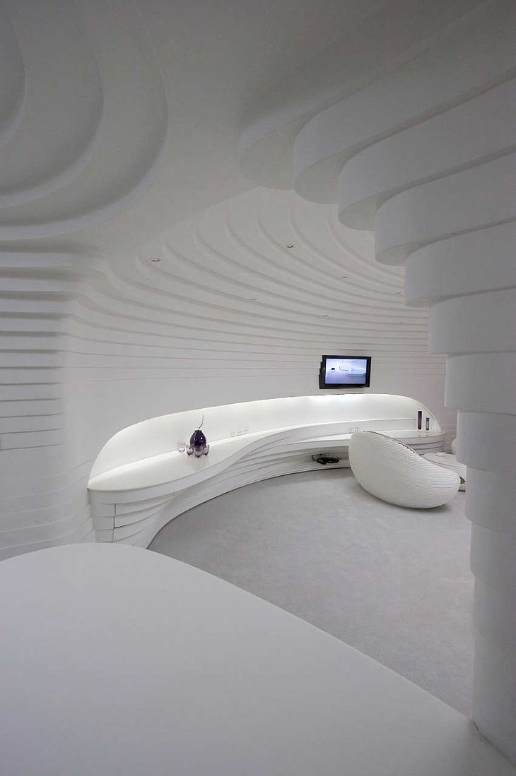 The overall design incorporates a flexible, freeform structure to mirror the slopes' snow-covered peaks and shifting landscape. Each residence is reminiscent of arctic igloos, curving into a domical form. The clean lines and flow of each room are very contemporary, and the dominance of white resembles the natural landscape covered in fresh snow. It is hard to ignore the overwhelming beauty of your surroundings during your stay, both inside and beyond the Barin Ski Resort.