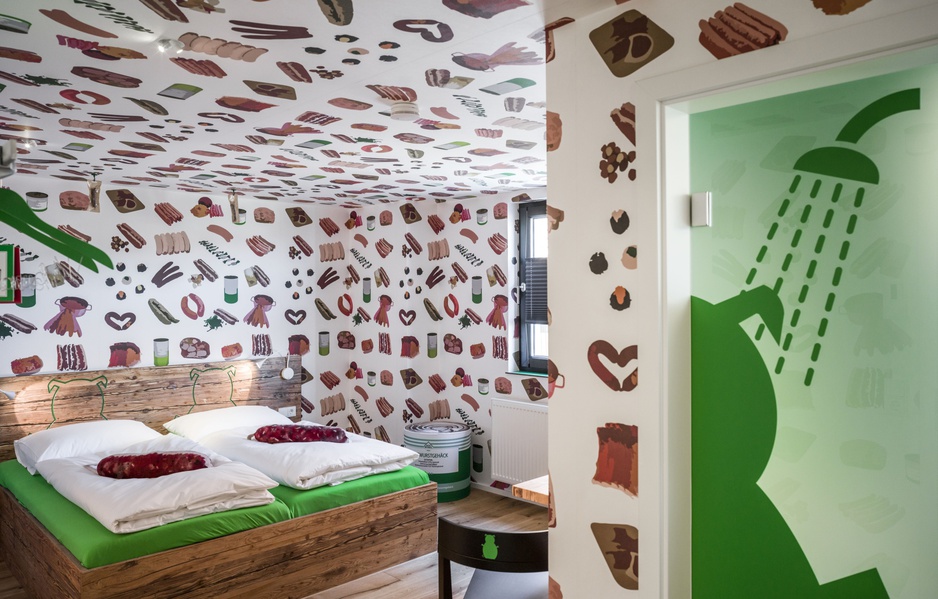 The stairwell has butcher's knives on the wall, designed by Julia Böbel, which leads to the rooms, where the wallpapers have sausage patterns, and the pillows resemble oversized bratwurst.