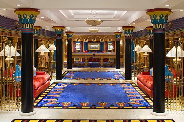 The entrance hall is lined with rare Statutario marble (the same kind used by Michelangelo in his sculptures). In total, precious marble covers 24,000 square meters in the hotel.