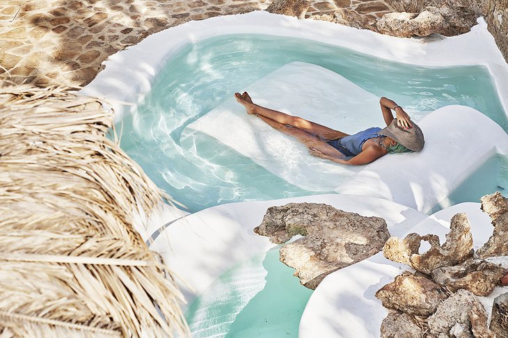 Cocoon chairs are hanging above the outdoor pools, elegantly held by pieces of handcrafted tree trunks.