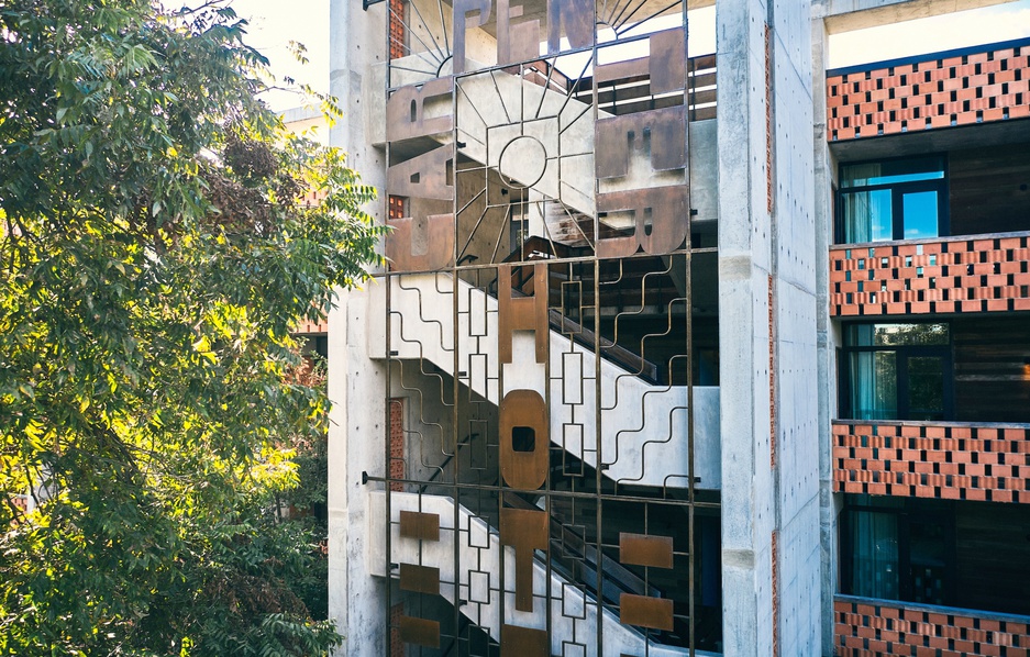Located close to the Colorado River in the Southern part of Austin, the Carpenter Hotel is housed in a mid-century brick building plus a Brutalist-style extension for the hotel's rooms.