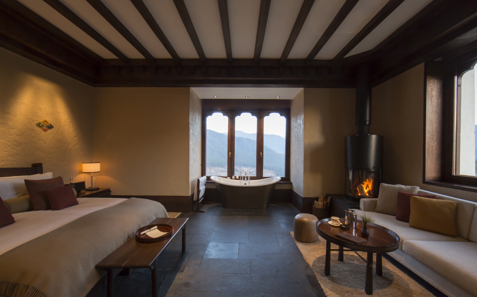 Gangtey Lodge is located right in the midst of this magical land. It's a luxurious base in the Gangtey Valley, an ideal spot to start your daily adventures. Only twelve suites in the farmhouse-style building guarantee a sense of privacy. Interiors are decorated Bhutanese-style with warm natural fabrics, a self-standing bathtub with spectacular panorama, and a wood-burning fireplace for chilly nights. The traditional Bhutanese Hot Stone Bath or "Dotsho" is a must-try. It's a popular form of natural medicine that's supposed to relieve you from pain. Water is heated by river rocks, releasing healing minerals. The use of local aromatic herbs completes the exotic spa experience.