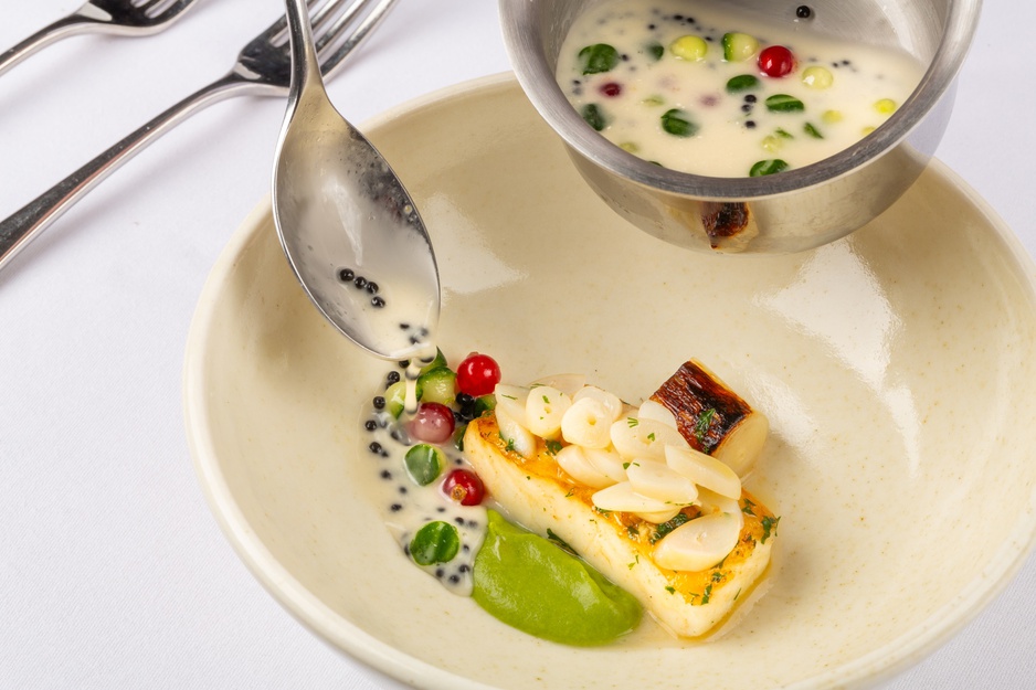 The evening menu is particularly popular for its selection of freshly caught fish from the coast, as well as fruits, herbs, and vegetables from the castle garden.