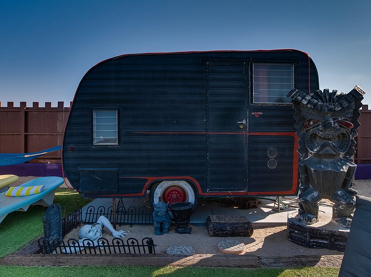 This is a big one! The 40-foot 1950s trailer is a homage to "B" reel movies, and it can accommodate up to six people.