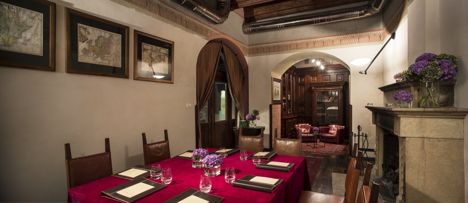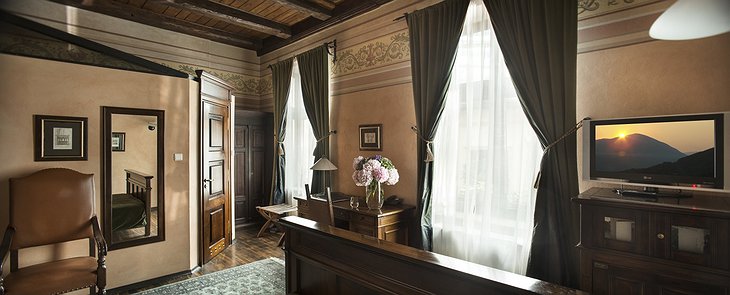 Many elements of the 14th-century construction have been preserved and emphasized in the modern restorations, including the wood-beamed ceilings and restored frescoes in many of the suites.