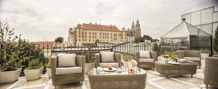 The medieval vaulted cellars are home to the sauna and swimming pool, while the rooftop terrace offers breathtaking panoramic views of the Wawel and the cityscape.