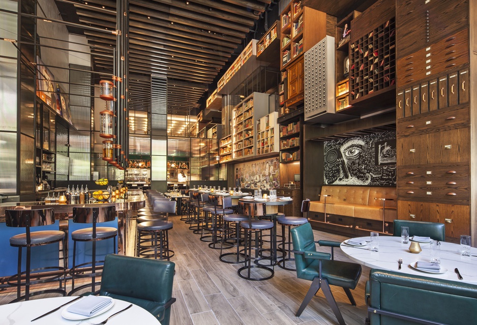 The public spaces resemble a crossover of an Art Deco interior and a science lab. There’s a Felix Guyon’s zoetrope in the reception that guests can set in motion, lights suspended by cords attached to weights and pulleys, and an impressive collection of jars and tubes in the restaurant. But with all the science-inspired décor, the interiors don’t feel cold or sterile. Quite the opposite, EMC2 is a welcoming and playful space, inviting guests to explore.