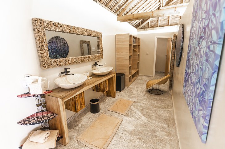 This can be witnessed through the natural materials used inside, like bamboo roofs, sandbag walls, and water treatment plants.