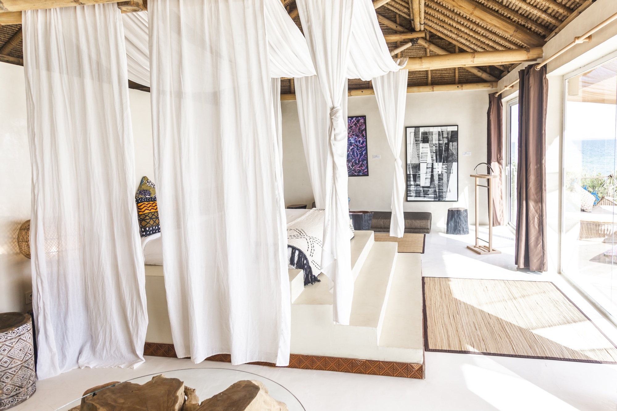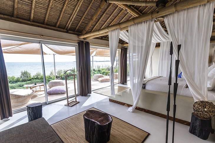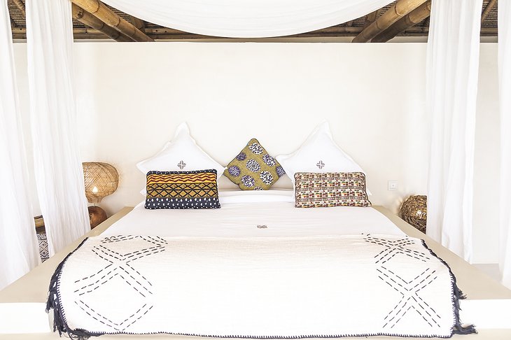 Four-poster beds and ethnic furniture make these spaces extra cozy.