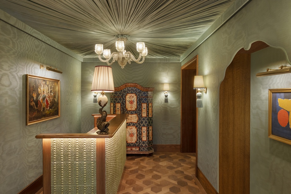 Le Grand Mazarin is a masterful blend of vintage furniture, fixtures, classic paintings, rugs, and lamps with borderline cartoonish elements, all of which create a truly unique and elegant environment.
