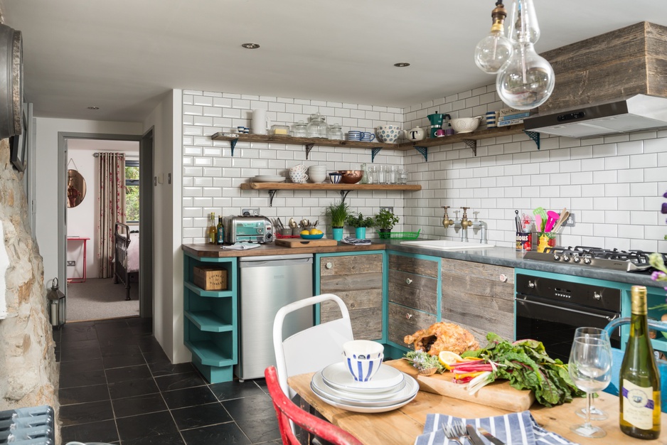 The heating is solar-powered, and there is a wood burner to keep guests cozy in the winter months. The kitchen features a washing machine, fridge/freezer, microwave, and electric oven. The bronze Victorian bed is made with hand-printed Egyptian cotton sheets, offering pops of pink and pastel accessories peppered throughout. Each room has an electric injection, from flashes of neon and royal blue velvet in the living area to the tile splashback in the kitchen area.