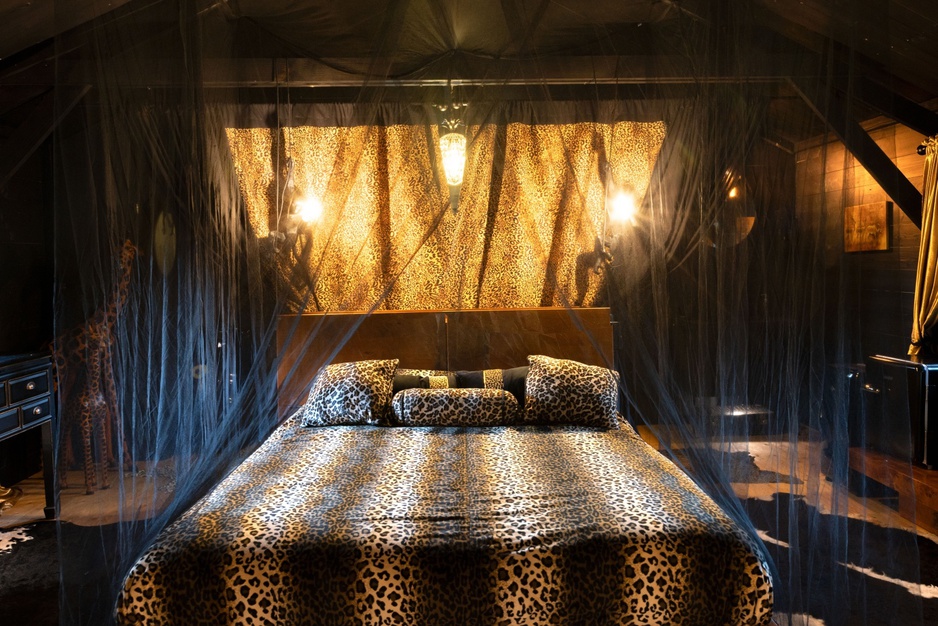 The lodge's mysteriously dark interior is filled with wild animal motifs.