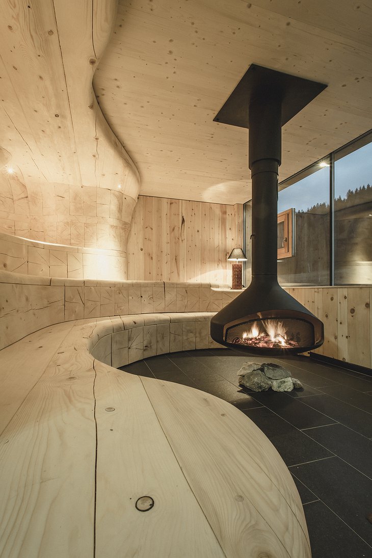 The Finnish sauna located on the top in the wellbeing area has beautifully curved wooden walls and an awe-inspiring view of the Leogang Mountains. Hence where the "panoramic heat" nickname comes from. How about some fresh mineral mountain water in the organically shaped resting bunks after a sweaty session? There is also an empty room, which is all about silence and mountain views. Head over to the rooftop terrace to get some cool drinks from the island bar.
