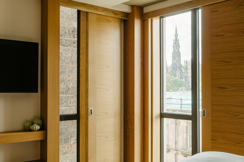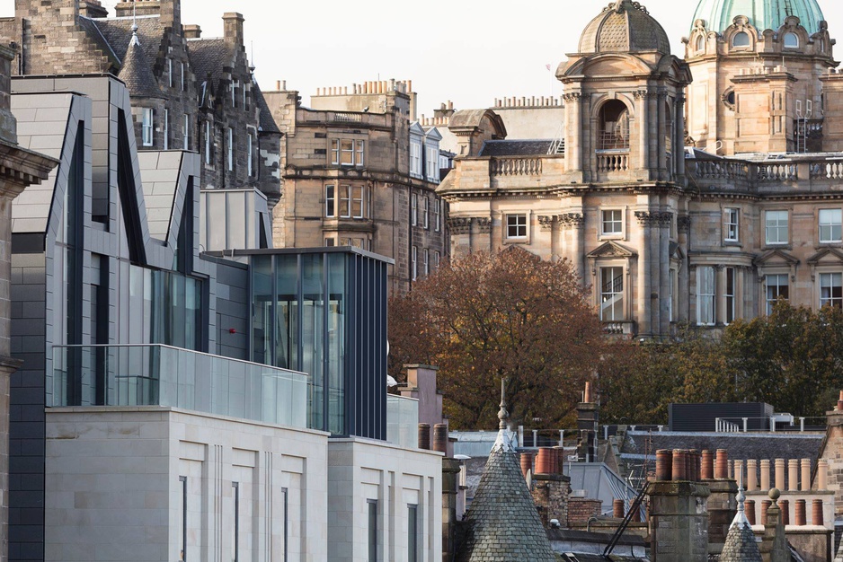 The most significant architectural challenge to face is to fit in a modern building in an old town protected by the UNESCO World Heritage Site. The globally renowned architects JMARCHITECTS and famous design studio FG Stijl squared up. They did a remarkable job filling in a gap in the historical quarter while respecting its antique environment. The perky silhouette of the roof follows the same pattern as the neighboring buildings. Even the sliding oak shutters pay tribute to the original window fixtures of the historic Auld Toun (Old Town in Scots).