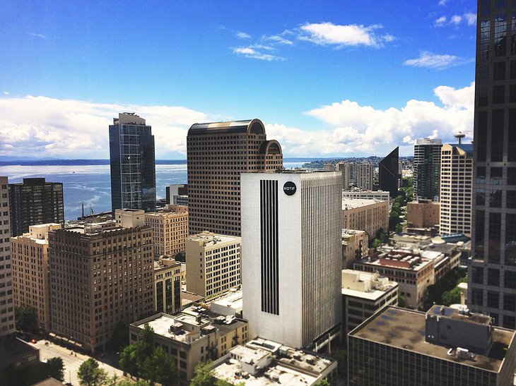 The hotel's design was inspired by the local music and art scene, drawing upon the avant-garde tastes and entrepreneurial spirit that makes Seattle unique. Recent renovations were completed with the help of local designers with detailed touches such as locally sourced wood, native artwork, and cutting-edge technology that makes the spaces digitally interactive. Each of the 329 guest rooms and suites offers stunning views of the Seattle skyline, Elliott Bay, Puget Sound, or the Olympic Mountains. You can also enjoy this panoramic view from Frolik Kitchen on the fifth floor, which features the largest outdoor patio in the downtown area and exquisite cuisine.