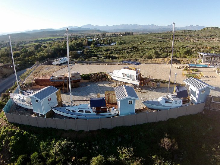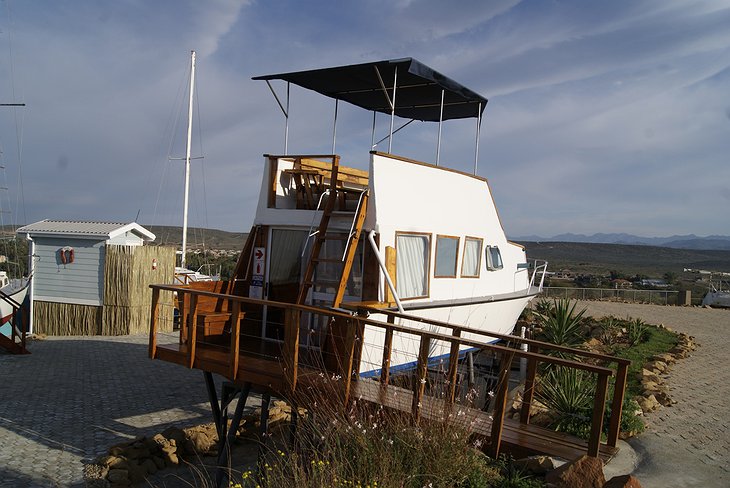 The quirky lodge also offers a swimming pool and terrace garden, a private Captain's bar, and a traditional South African braai (barbecue-style) restaurant. A complimentary full breakfast is served each morning. The surrounding area offers views of the Swartberg Mountain Range in this South African arid landscape. A popular area for hiking, guests will also find the Safari Ostrich Show Farm less than five miles away from this unique lodge and the Cango Wildlife Ranch just one mile away.