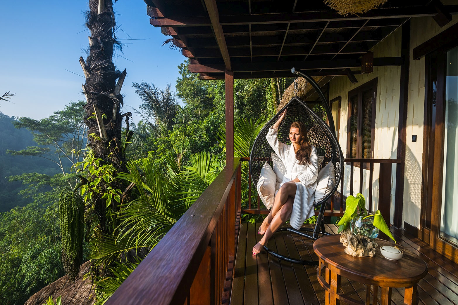 Open the hand-carved tinder door of your room to reveal the intimate interior that's open to the jungle via a balcony or a terrace.