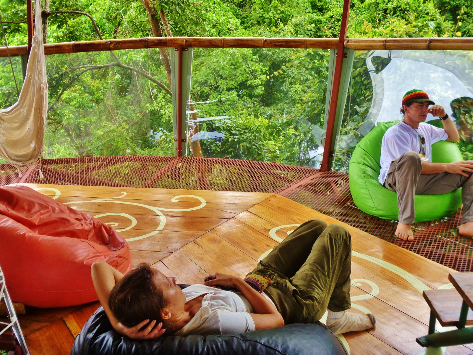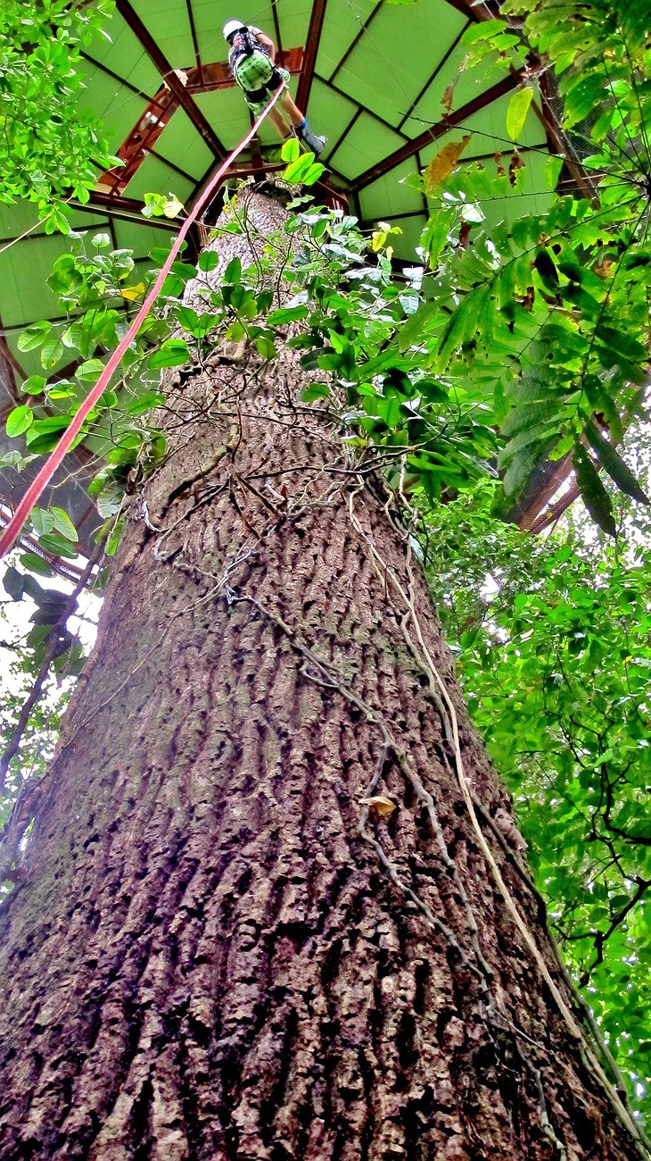 This could be the first structure ever built from the top-down. The two-floor room-and-observation-deck is suspended from a tree using nylon ropes, nylon stripes. Not one screw or nail was used in its construction. Water for the bathroom comes from rainfall and electricity comes from solar panels.