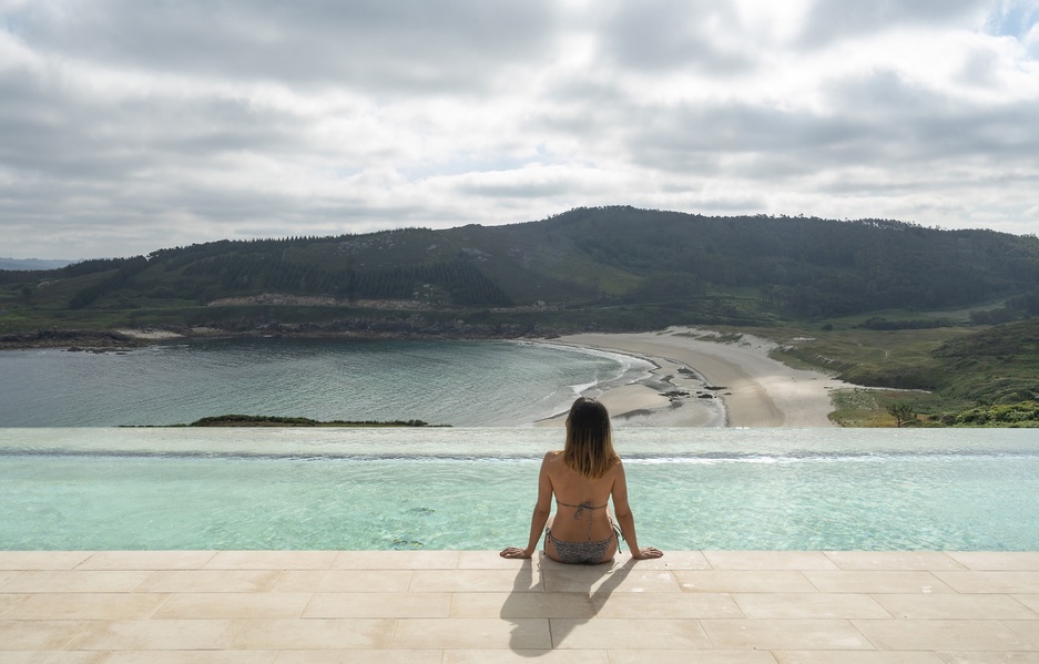 The spectacular infinity pool gazes out on the Atlantic, its glass wall creating the illusion that it merges directly with the ocean beyond. It overlooks Lourido Beach and the coastline, offering perhaps the most dramatic views in the entire parador. Solar energy heats the pool.