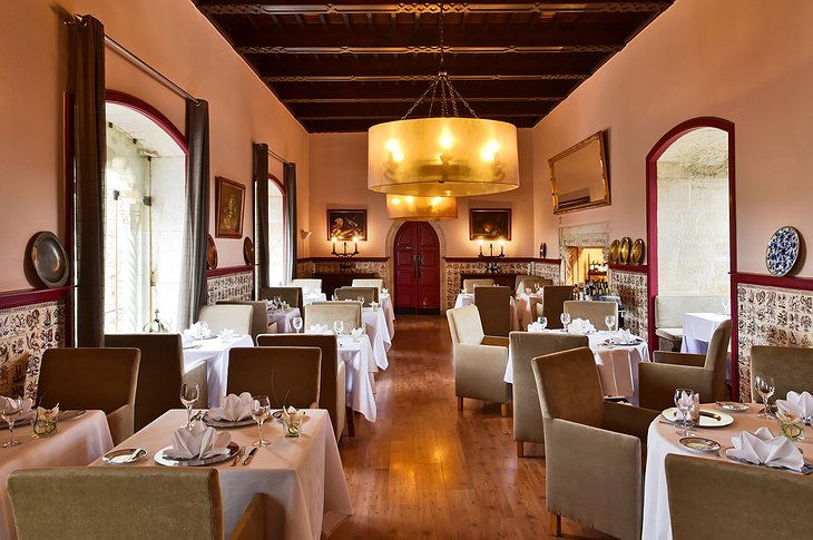 It was bought by a luxury hotel chain Pousadas de Portugal specializing in historic hotels. Unlike some other castles-turned-hotels, this one doesn’t forcefully try to reconstruct the antique interiors. Instead, the rooms are furnished modernly with just slight hints at the building’s regal past: a fragment of exposed stone wall here, a chandelier, or a four-post bed there. The common areas have a stronger castle theme with suits of armor and tapestries decorating the walls, but still tastefully blended with contemporary furniture.