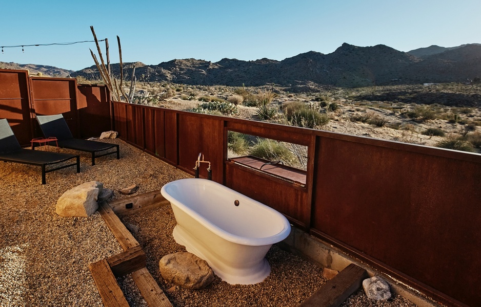 Between them, the two properties cover roughly 10 acres of mountain-facing desert, and across all of it, the design philosophy is the same: bring the outside in, keep it warm, and make sure the soaking tub has a clear view of the sky.
