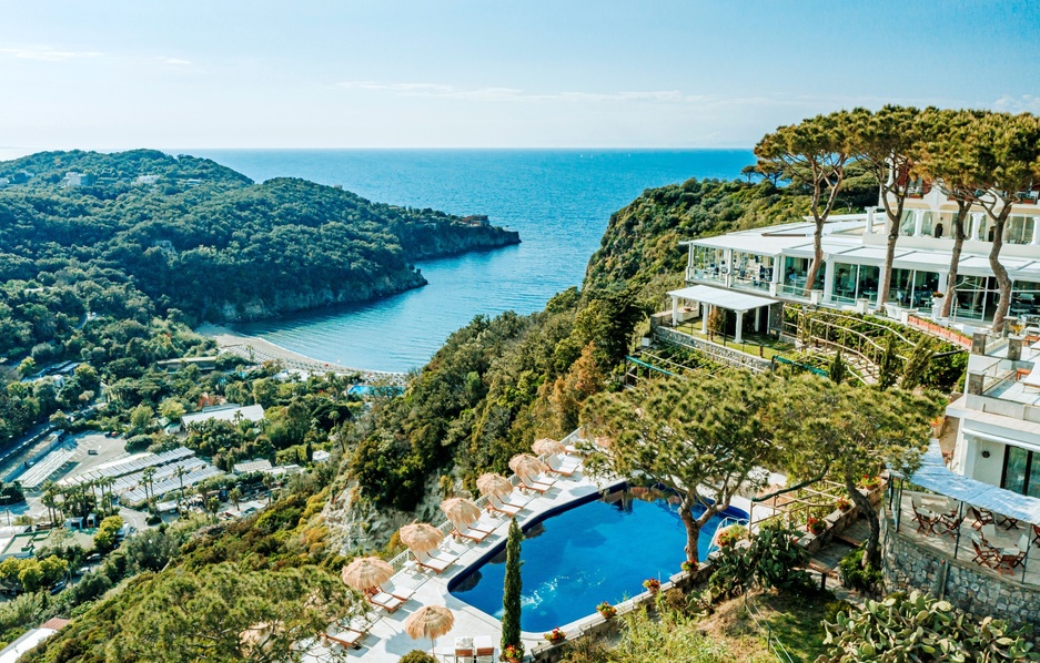 The thermal spa complex known as H2O Pool Park is the resort's aquatic centerpiece - five panoramic pools positioned to overlook the harbor at Lacco Ameno, with Procida and the Bay of Naples filling the background.