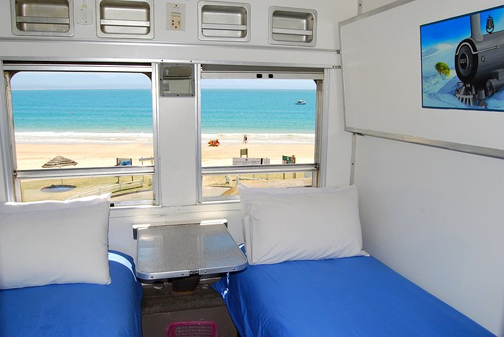 Have you ever been on a train as it passes along a stunning landscape? You think if only the train would stop right here so I could explore and take in the sights some more... That dream can now become a reality by hopping on The Santos Express! This stationary train sits just under 100 feet from Santos Beach in Mossel Bay, South Africa. Perfect for those who want the convenience of beachside lodging, this train offers plenty of amenities to keep guests happy.