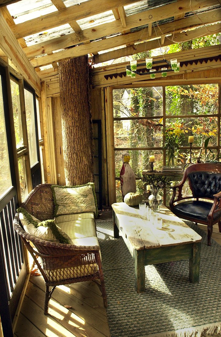 The living room is tastefully furnished with antique furnishings, including 80-year-old butterfly-filled windows that seat six and offer a view of the forest from its balcony.