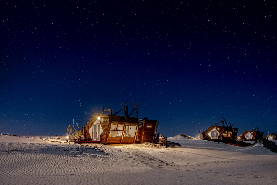 The lodge is nestled between the spectacular dunes and the Atlantic Ocean shore. It has ten shipwreck-shaped cabins, eight twin and double cabins, and two family eco-friendly suites running on solar power. Each cabin is equipped with a wood-burning stove and plushy blankets for chilly desert nights. The cabins have wooden decks where you can admire the harsh beauty of the Namibian desert.