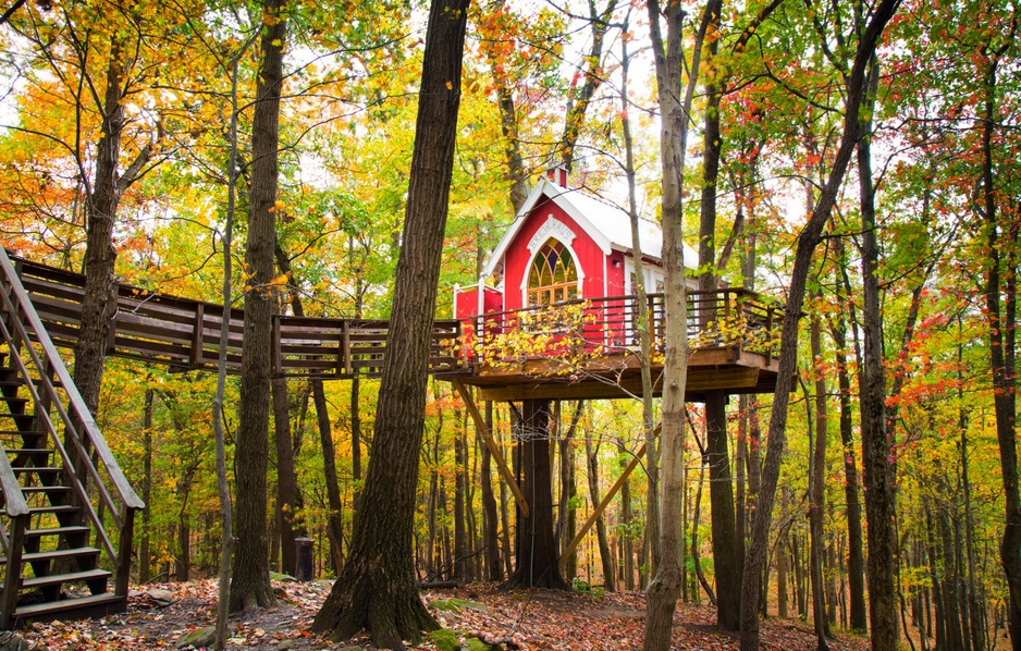 Described by the resort as their most romantic, the Moonlight Treehouse was constructed using 100-year-old barn siding sourced from one of its Amish designers in the town of Danville, alongside hand-hewn beams. The standing seam metal roof was chosen specifically so you can hear rain falling on it.