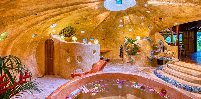 The ecolodge appears to be nothing out of the ordinary from afar, but upon close inspection, you'll find out that some parts might be the result of an ayahuasca trip that went well. The wooden structures hide eye-popping colors, bursting with positive energy. If this was not unique enough, a converted school bus has a house built around it. Hammocks and colorful self-standing outdoor bathtubs decorate the five back-to-your-childhood houses. The Beach Suite and Beach House offer ocean views and musical symphony from the sound of the waves. Crystal House, Garden House, and the Tree Houses are tucked deeper inside the greenery of the tropical forest.