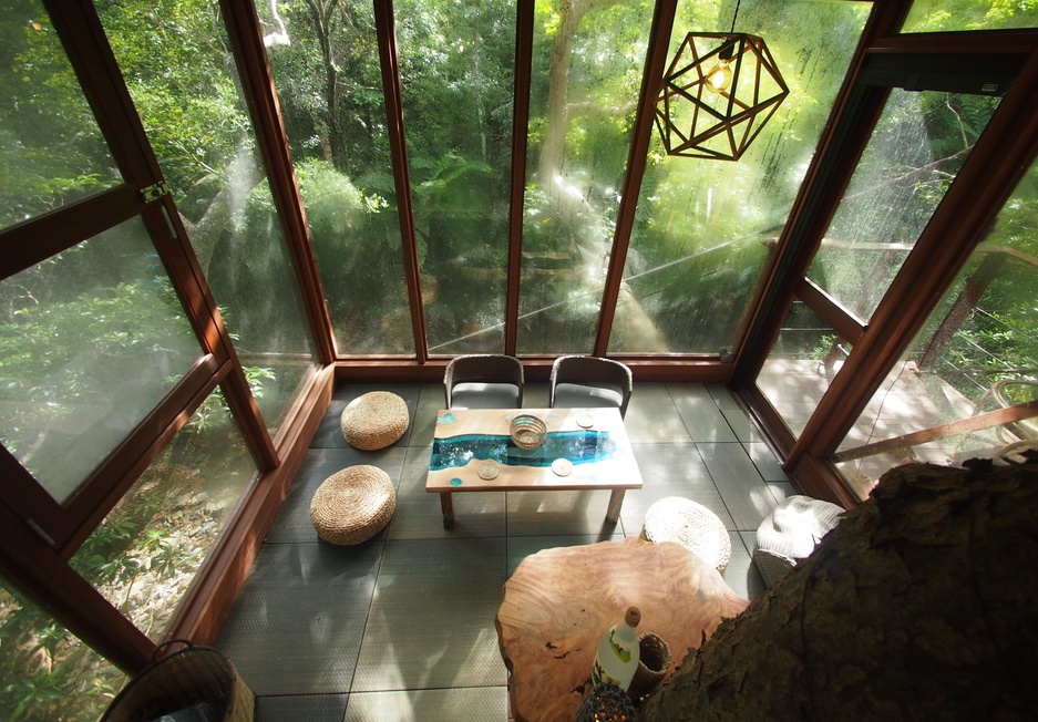 This pretty little treehouse is airconditioned, and it has futon mats.