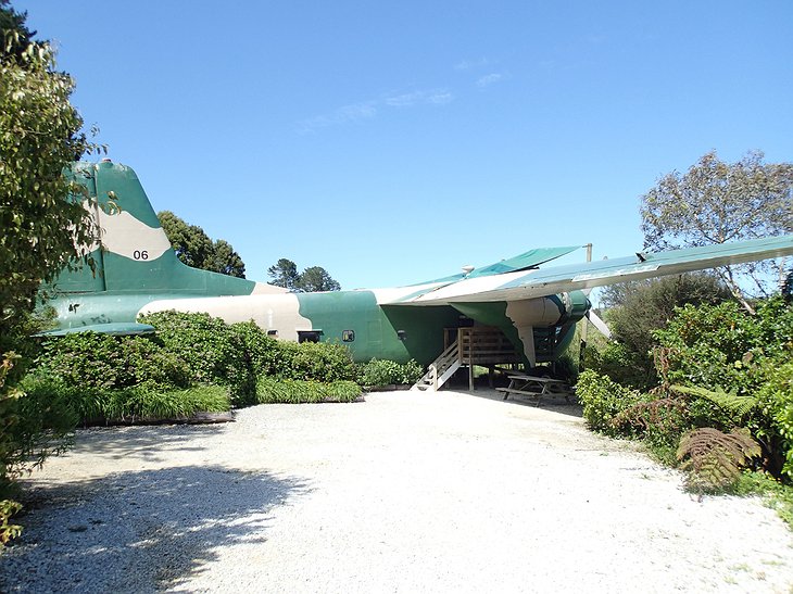 The Hobbit Motel is a string of rooms built into a hillside that looks very similar to the fantasy home of Mr. Frodo. Each unit accommodates up to six people and has a bathroom and kitchenette. There is also a train which has been converted into a length of rooms which can host 5 people. One of the last US plane to leave Vietnam was a Bristol Freighter, it is randomly parked up on the farm and that too has been converted into comfortable living quarters. Premier accommodation can be found in a converted WW2 anti-submarine ship which is moored by the park. It once patrolled the seas around New Zealand and has a three-floor suite and many other room options inside.
